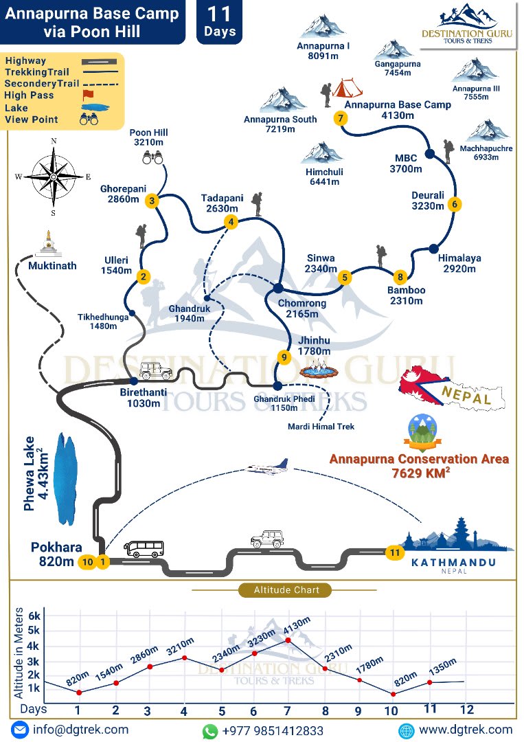 The Annapurna Base Camp with Poon Hill Trek is one of the most popular and rewarding trekking routes in Nepal. This 11-day journey perfectly combines natural beauty, cultural experiences, and gradual altitude gain, making it ideal for both beginners and experienced trekkers. Designed by Destination Guru Tours & Treks, this itinerary ensures a safe, enjoyable, and memorable Himalayan adventure.